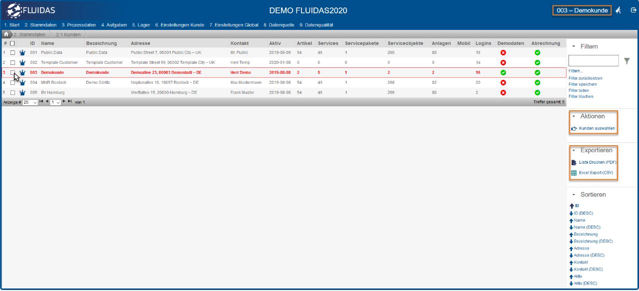 Zur Auswahl eines Kunden markiert man zuerst die Checkbox der Zeile des Kunden und wählt anschließend unter Aktionen “Kunden auswählen”. Der ausgewählte Kunde wird anschließend rot umrandet markiert und ist oben rechts in der Webansicht sichtbar. Über “Exportieren” lässt sich die Übersicht als PDF oder CSV-Datei herunterladen.