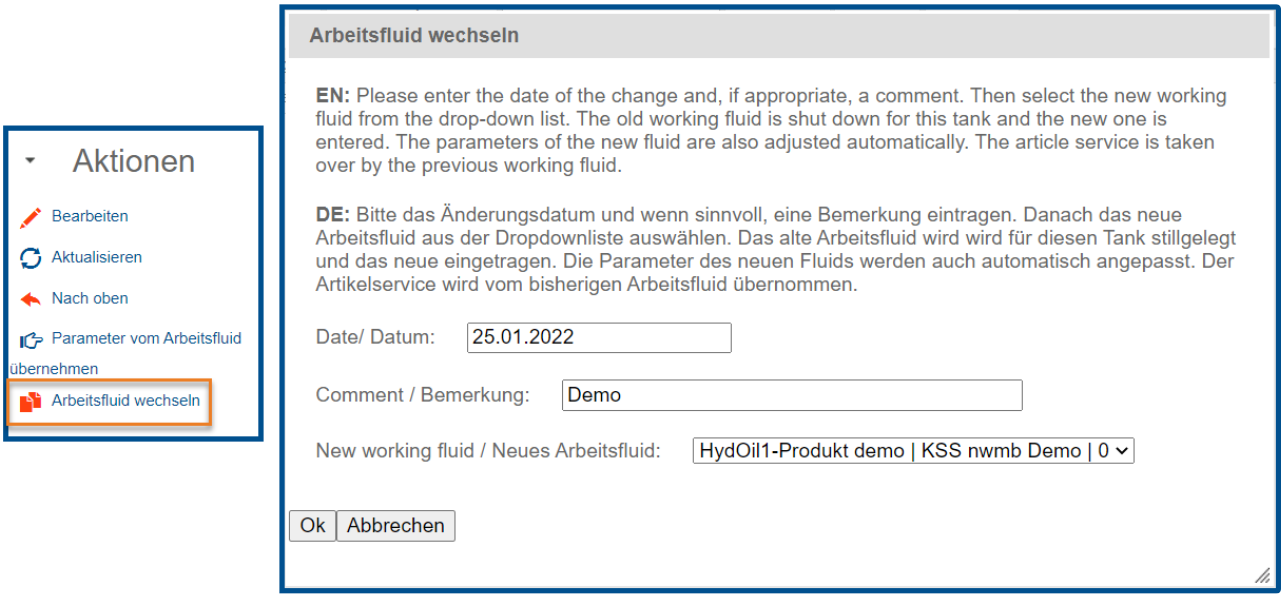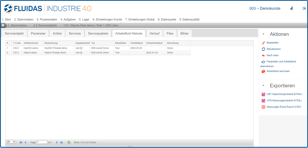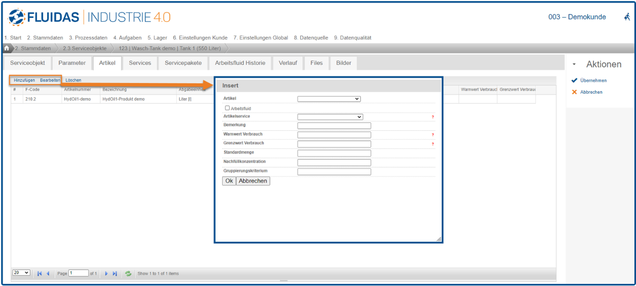 Nun kann der Artikel im Serviceobjekt ausgewählt und relevante Daten gepflegt werden. Ist die Checkbox beim Feld Arbeitsfluid angehakt, wird der Artikel für das Serviceobjekt als Arbeitsfluid festgelegt.
