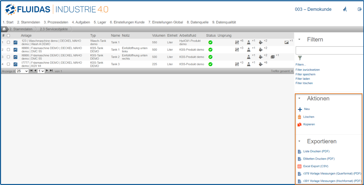 Über “Exportieren” können eine CSV-Liste aller Serviceobjekte und Messungsprotokolle heruntergeladen werden. Auch die Etiketten, die an die Serviceobjekte angebracht werden, können hier erzeugt werden.