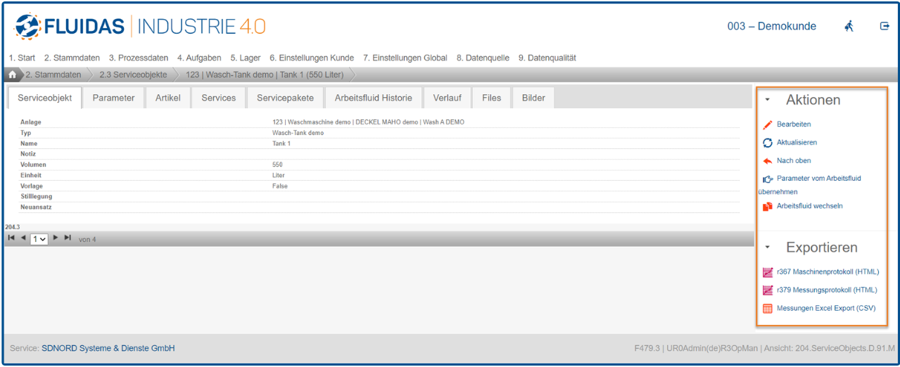 Die Detailansicht des Serviceobjekts kann wieder über das Symbol neben der Anlage geöffnet werden. Über diese kann das Serviceobjekt über die Aktion “Bearbeiten” bearbeitet werden. Hier ist es ebenfalls möglich, verschiedene Protokolle unterschiedlicher Dateitypen (.pdf, .html, .csv) zum Serviceobjekt zu exportieren.